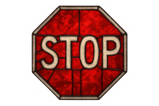 Stained glass stop sign with red octagon shape, showing a warning symbol for traffic control and road safety