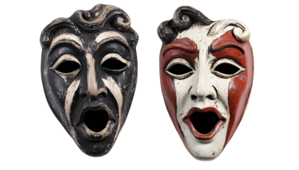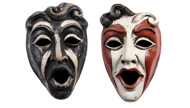 Two theatrical masks, different colors, expressing emotions, cut out transparent