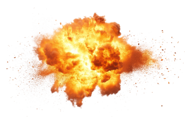 Massive destructive explosion featuring intense bright orange fireball erupting upwards sending dark smoke plumes and debris violently scattering across the frame in a powerful cosmic event depiction