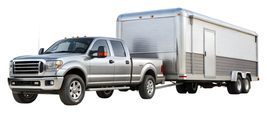 A white SUV towing a camping trailer is shown from above on an isolated background, highlighting its practical design for motorhome adventures. Element for advertising and design.