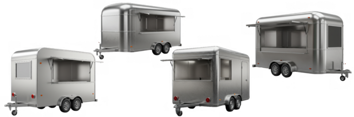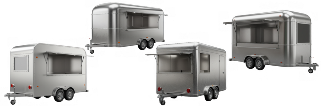 Food truck trailer stainless steel vendor cart commercial kitchen mobile business catering outdoor metallic street service stall isolated on transparent background, png file