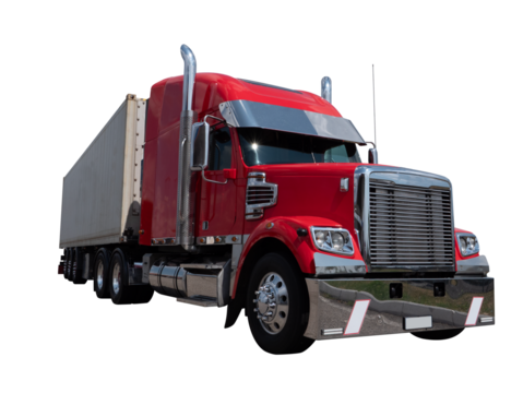 Empty trailer truck isolated on transparent background. Back view. Camera along the central axis of the trailer. 3D illustration.