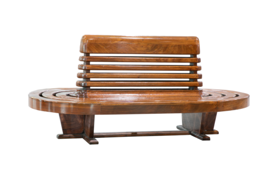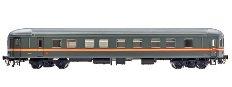 vintage passenger train car with sleek design, featuring dark green exterior and orange stripes, isolated on transparency background