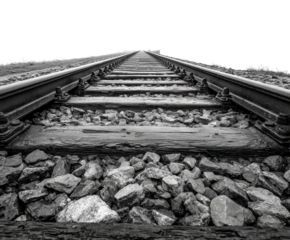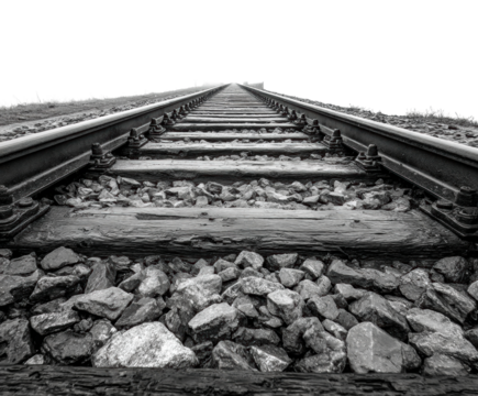 Train tracks stretching to the horizon in b&w PNG, isolated on transparent background
