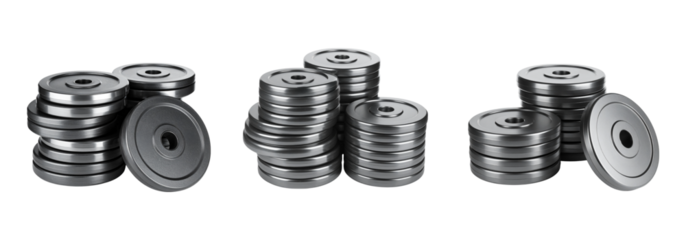 Stacked weight plates for strength training and fitness are ready for a workout session isolated on transparent background