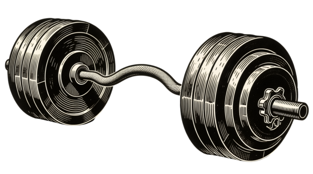Detailed illustration of a heavy adjustable dumbbell with textured grip on a black background