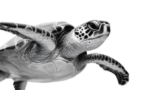 Majestic sea turtle gracefully swimming through clear waters with a serene expression and intricate shell patterns in close-up view
