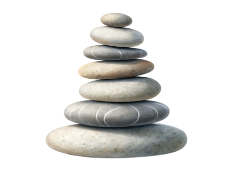 Perfectly stacked smooth grey river stones balanced precariously showing harmony serenity and tranquility isolated on transparent background