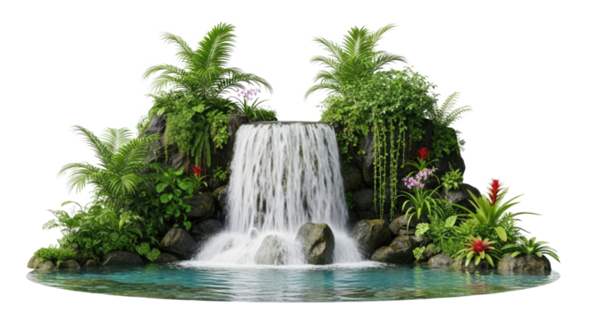 A serene tropical waterfall surrounded by lush greenery and vibrant flowers, with a tranquil pool below.