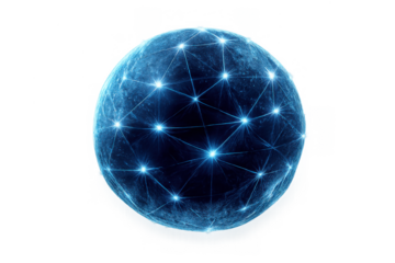 Blue globe with arrows symbolizing global data transfer on transparent background