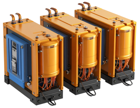 3D Composition of Cast Resin Transformers with One Tilted Forward, Dynamic Technical Icon, Transparent Background.