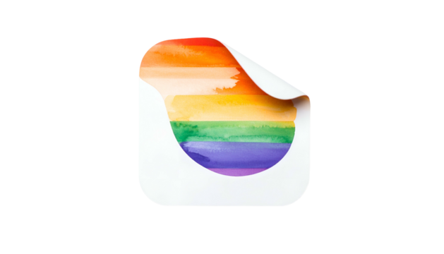 A sticker with peeling corner, showcasing a watercolor rainbow design on a black background
