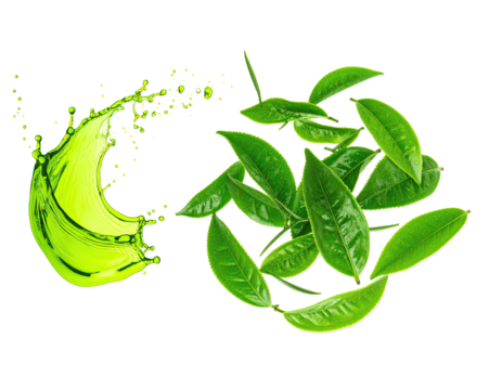 Artistic depiction of fresh green tea leaves with a vibrant splash of liquid on a black backdrop