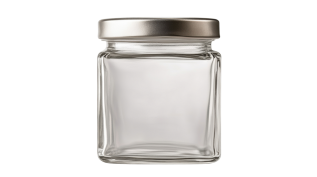 clear tall glass jar with silver lid, transparent, sparkly and brilliant, for food, liquids, sauces, grain, isolated PNG Background. Generative Ai.