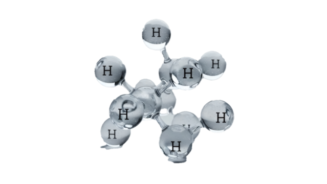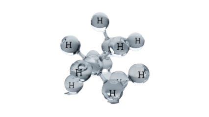 A 3D render of a complex molecular structure with clear hydrogen atoms and translucent bonds.