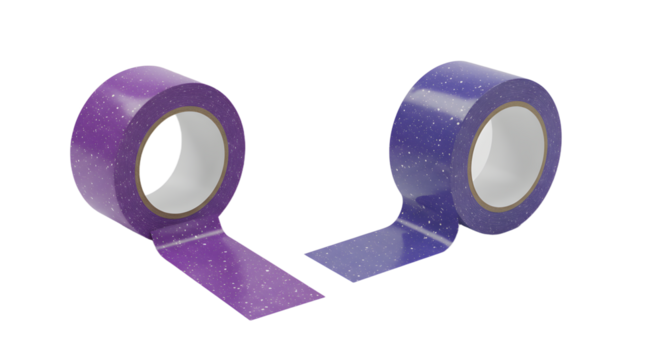 Two rolls of glossy purple decorative tape with white speckles, isolated on white background, perfect for crafts and gift wrapping