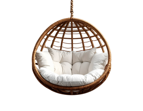 Chic wicker hanging egg chair with cozy white cushions showcased against a transparen