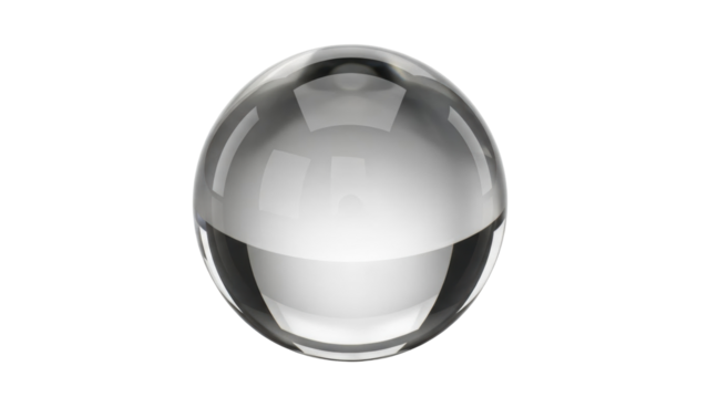 Clear glass sphere placed on a white background reflecting light from different angles showing a smooth surface