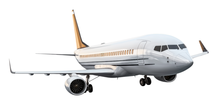 White passenger jet plane flying isolated on transparent background