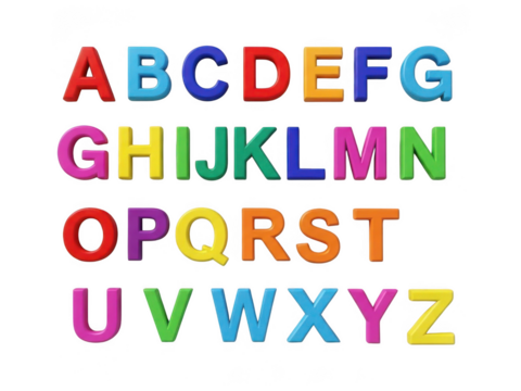 3D Alphabetical arrangement of puffy letters in a grid pattern against a plain colored space on transparent background