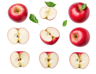 Apple background red green fruit slices leaves pattern wallpaper healthy eating food photography isolated on a transparent background.
