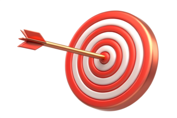 A 3D render of a red and white archery target with an arrow hitting near the bullseye, symbolizing success, precision, and goal achievement. background removed