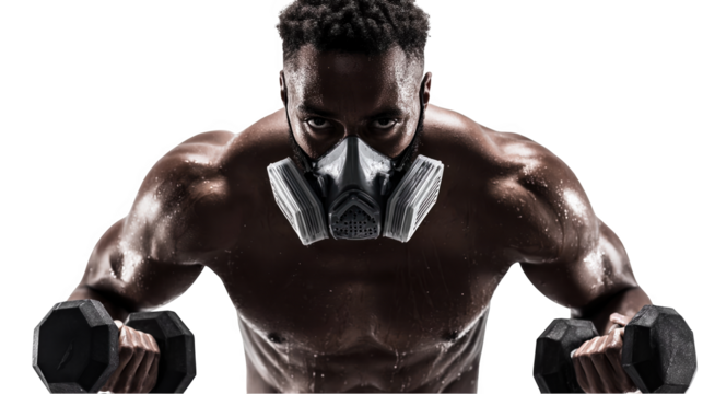 Muscular black athlete wearing a training mask lifts weights, showcasing his strength and dedication to fitness on a transparent background