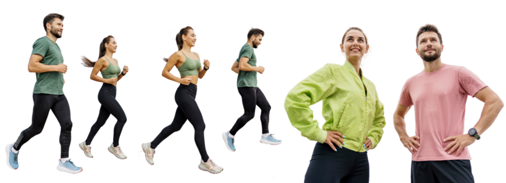 Warm-up joggers male and female athletes fitness exercises warm-up. Runners sports people photo collage. Active and healthy lifestyle. Transparent isolated background.