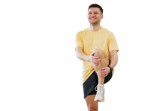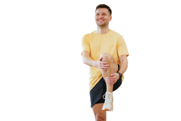 Warm up a sporty male trainer doing a workout in fitness clothes and sneakers. Transparent background.