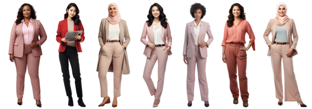 Three diverse business professionals, including a young adult Asian woman, a young adult Hispanic woman, and a middle-aged Caucasian man, standing in suits against a transparent background.