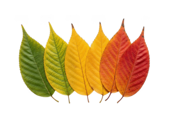 A gradient of autumn leaves showing color change from green to red isolated on transparent background
