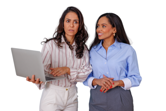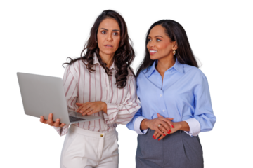 Focused team collaboration two colleagues working together on a laptop computer discussing a project transparent background