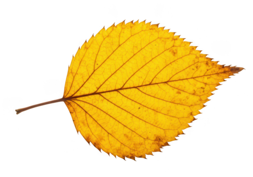 A single vibrant yellow leaf with prominent veins isolated on transparent background