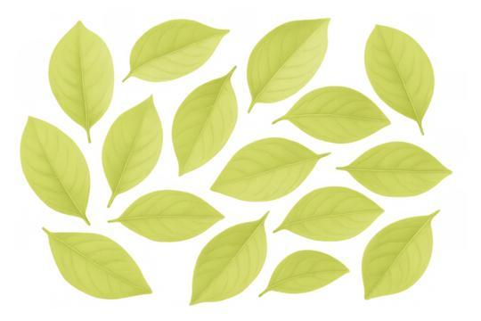 Fresh green leaves scattered on a transparent background, creating a vibrant natural pattern, perfect for spring and summer designs