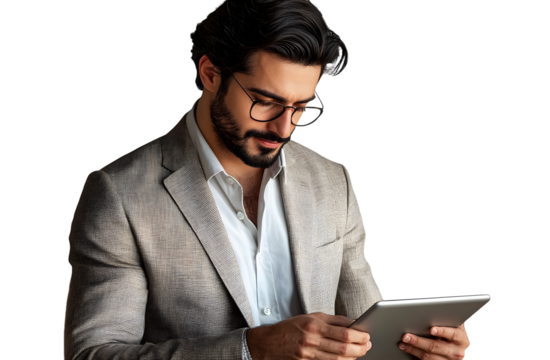 Smiling man with glasses using digital tablet on transparent background