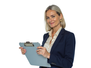 Business portrait isolated on white transparent background: A confident businesswoman with blonde hair smiles warmly while holding a clipboard against a neutral background, conveying professionalism