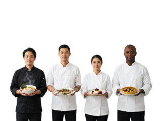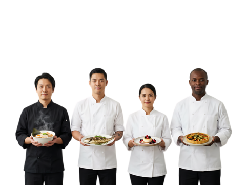 四人の料理人が仕上げた料理を披露する|背景なし・透過PNG・コピースペース