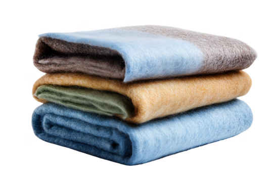 Brightly colored blue and gray striped towels and blankets displayed on black background with soft textures and folded arrangement isolated transparent png