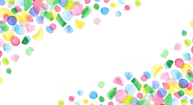 Red, yellow, and blue geometric shapes including circles, squares, and triangles are arranged on a transparent background, creating a colorful frame
