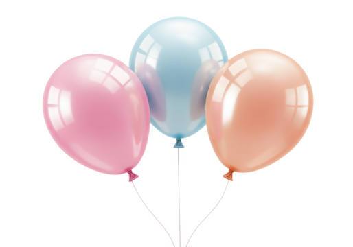 A set of three helium filled balloons with a soft iridescent sheen isolated on transparent background