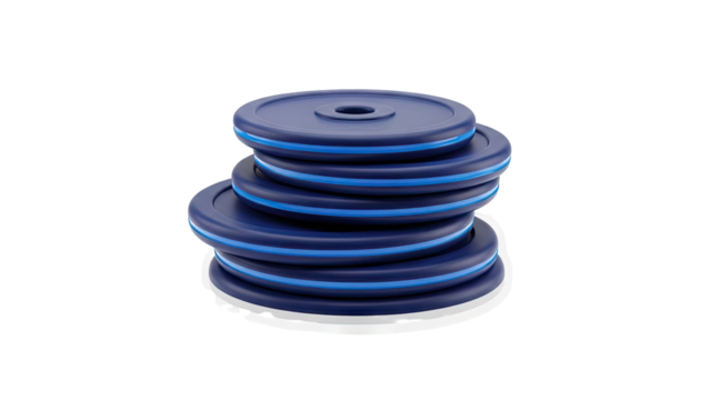 3D Stack of dark blue weight plates with blue stripes on transparent background