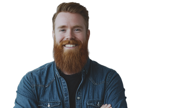 a man with a long beard and denim jacket standing in front of a transparent background, PNG image, PNG file, Generative art.