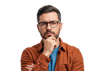 Contemplative bearded man in denim jacket transparent background