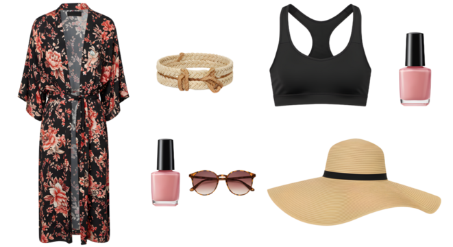 LIFESTYLE - Summer beach outfit flat lay featuring floral kimono, wide-brim sun hat, black bikini top, sunglasses, nail polish, and beige belt accessory