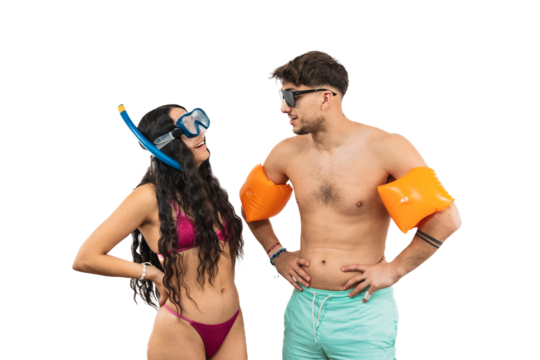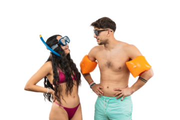 Midsection of woman and distant man in beachwear on transparent background
