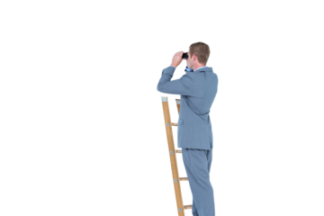 Businessman on ladder with binoculars transparent background