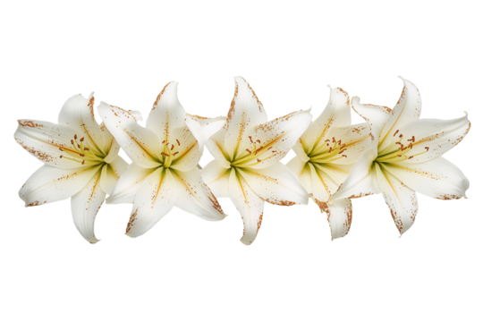 A row of pristine, fragrant white lilies, symbolizing purity and peace, blooms against transparent background.