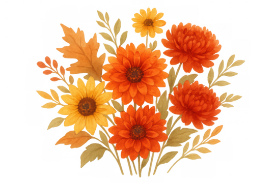 Watercolor autumn floral bouquet with sunflowers, chrysanthemums, and fall leaves illustration, transparent background