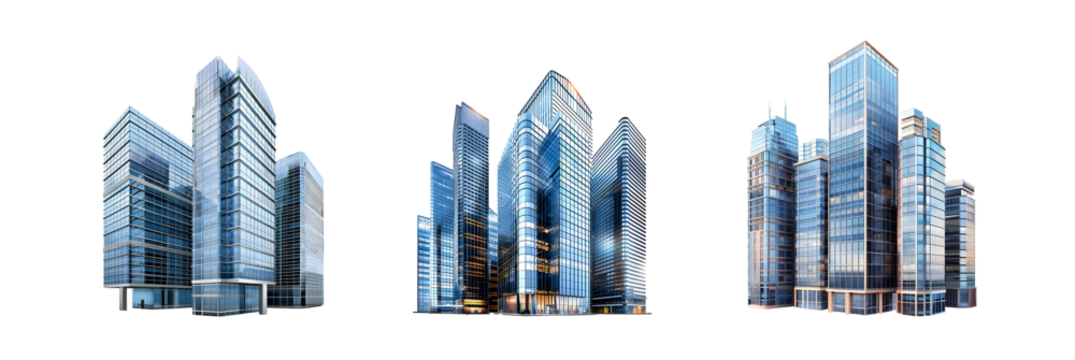 Pack of Modern Glass Skyscraper Buildings Isolated on transparent background