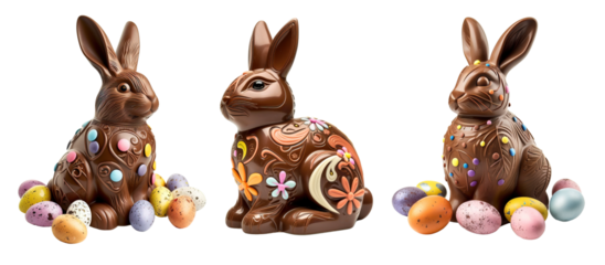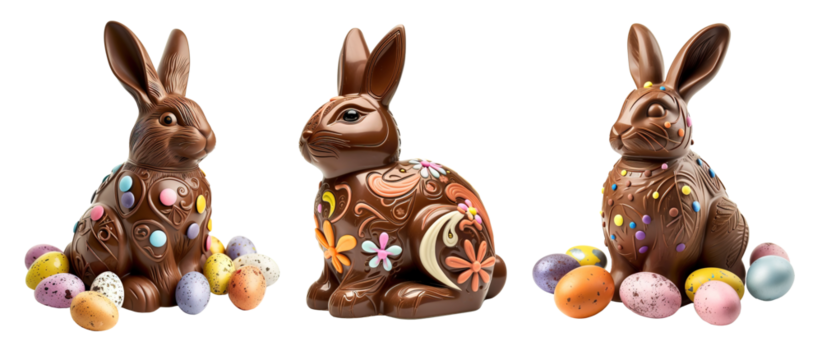 Easter rabbits with painted eggs, isolated on black, cut out transparent